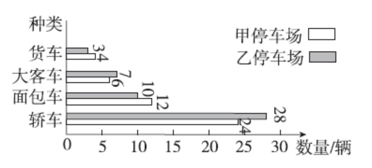 如图,甲停车场一共停车( )辆,乙停车场一共停车( )辆,( )停车场停的轿车少,( )停车场停的面包车少。