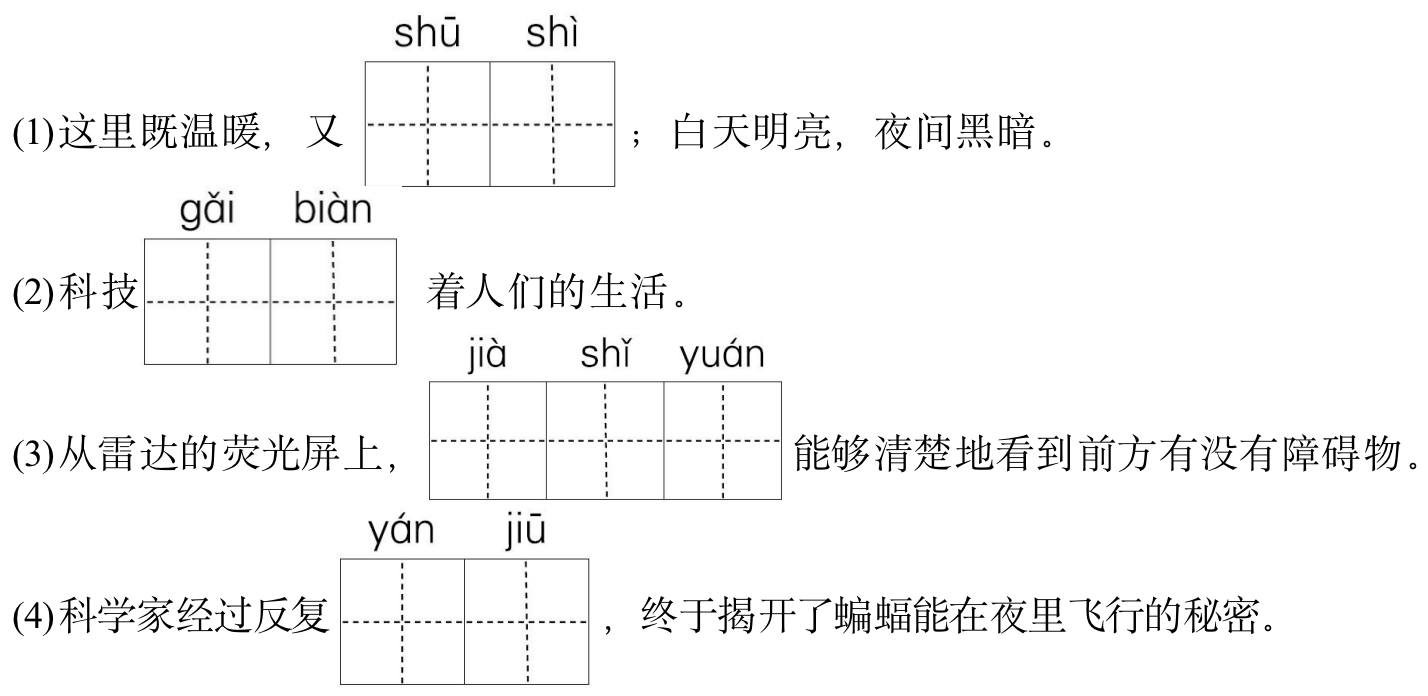 四、(一)12.科学家揭开蝙蝠能在夜里飞行的秘密花费了很多心思,付出了很多努力 13.仿照 清晰 揭露 前进