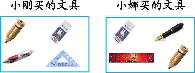(1)小刚买了( )种文具,小娜买了( )种文具,两人一共买了( )种文具。
