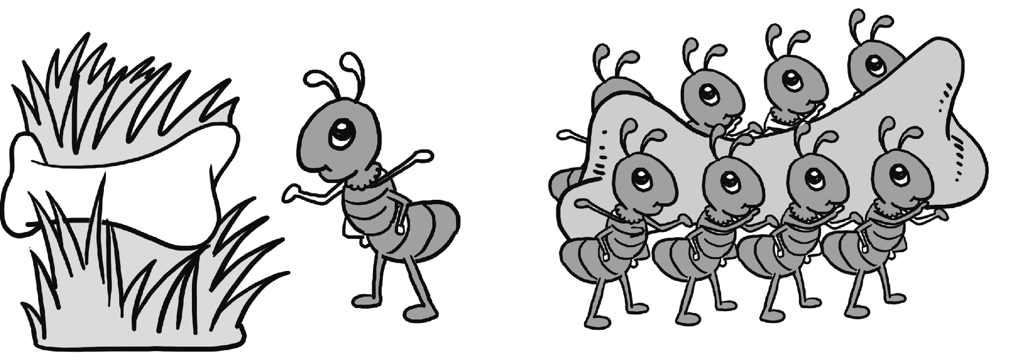 一个晴朗的日子,一只小蚂蚁出来找食物。它走着走着,忽然在草地里发现了一根大骨头。小蚂蚁高兴得手舞足蹈,赶紧跑过去搬骨头,可是骨头又大又重,它使出了浑身的力气也没有搬动。该怎么办呢?它急得走来走去,后来终于想到了办法,急忙跑回家去搬救兵。