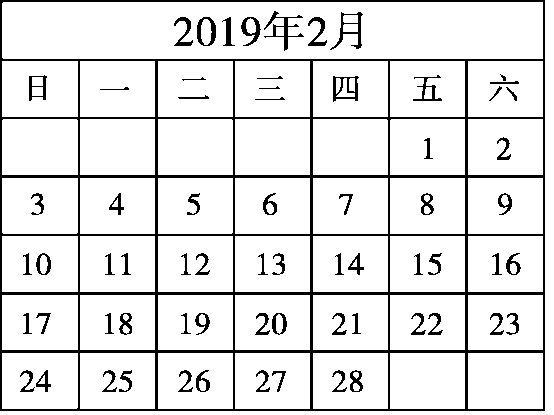 五、2019年1月31日是星期四,用下表制作一个2019年2月的月历表。(9分)