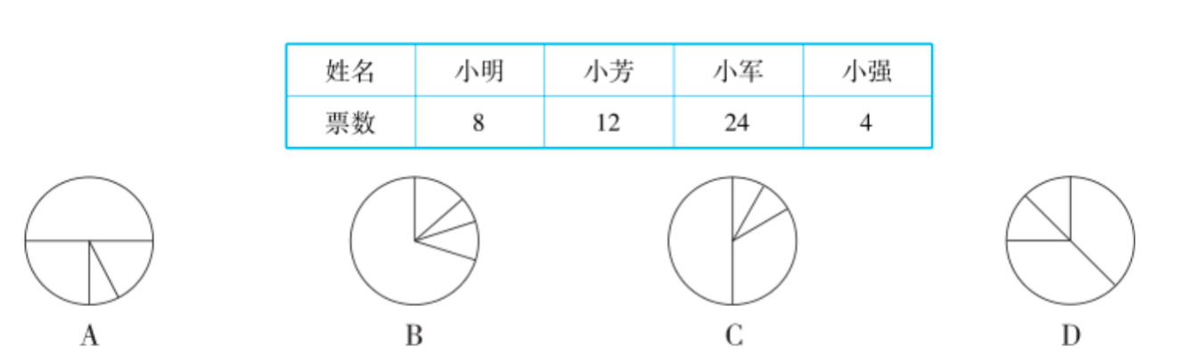 8.六(1)班有48名学生,期末评选1名学习标兵,选举结果如下表,下面( )图能表示这个结果。