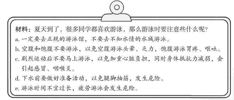 13.示例:饱腹游泳会导致胃疼、呕吐,你应该休息一会儿再去游泳。