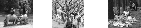 我国有许多风景优美的地方,可是芳芳却用自己的相机拍下了这些不和谐的画面,请你选择其中一幅图说说看后的想法。