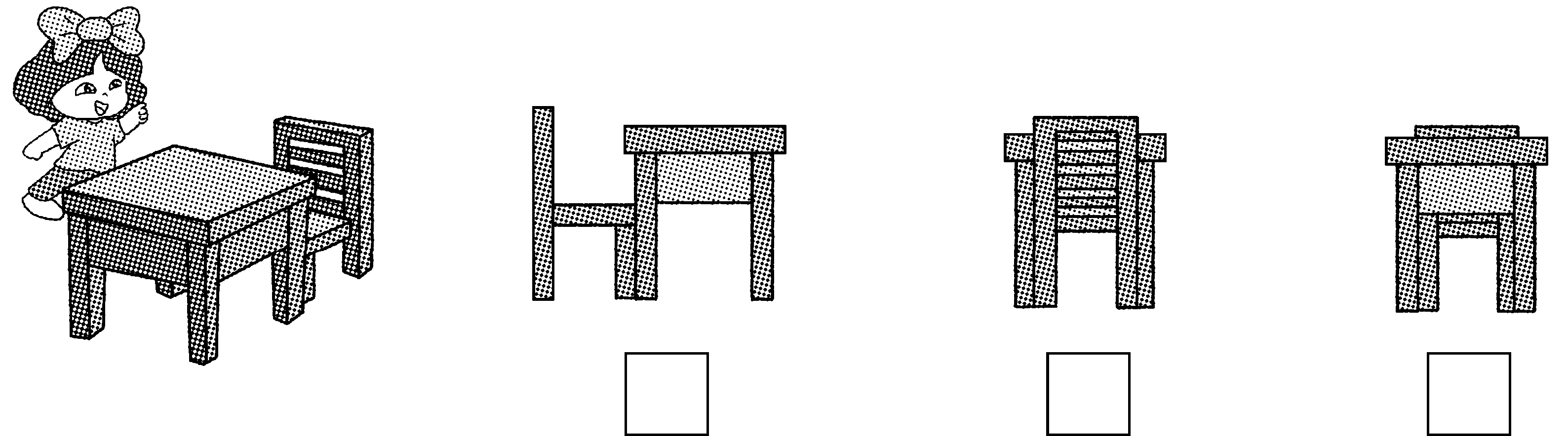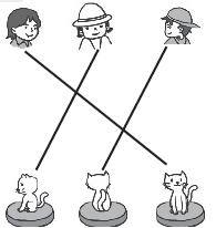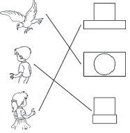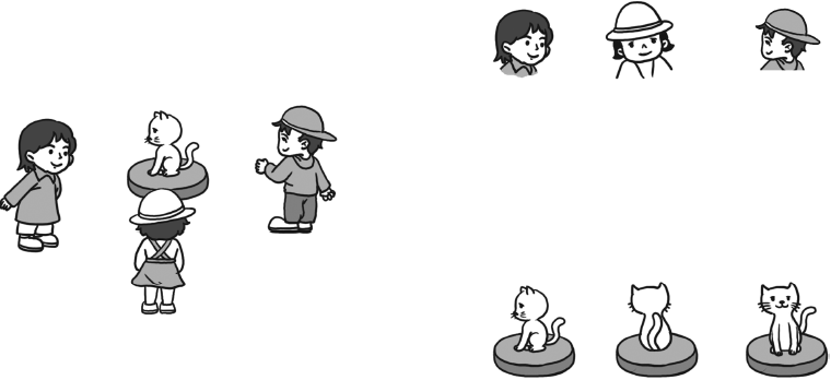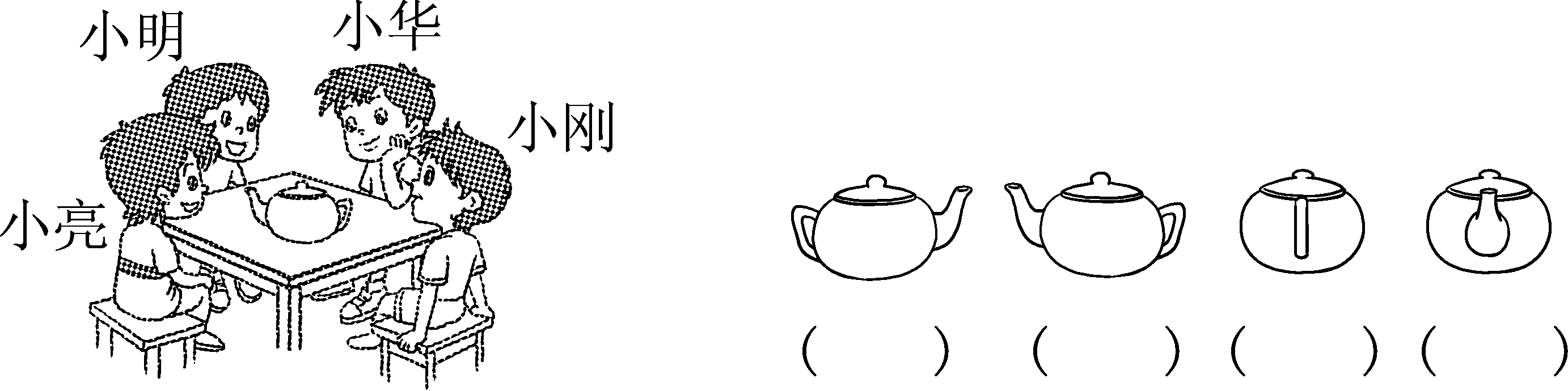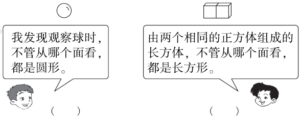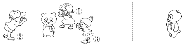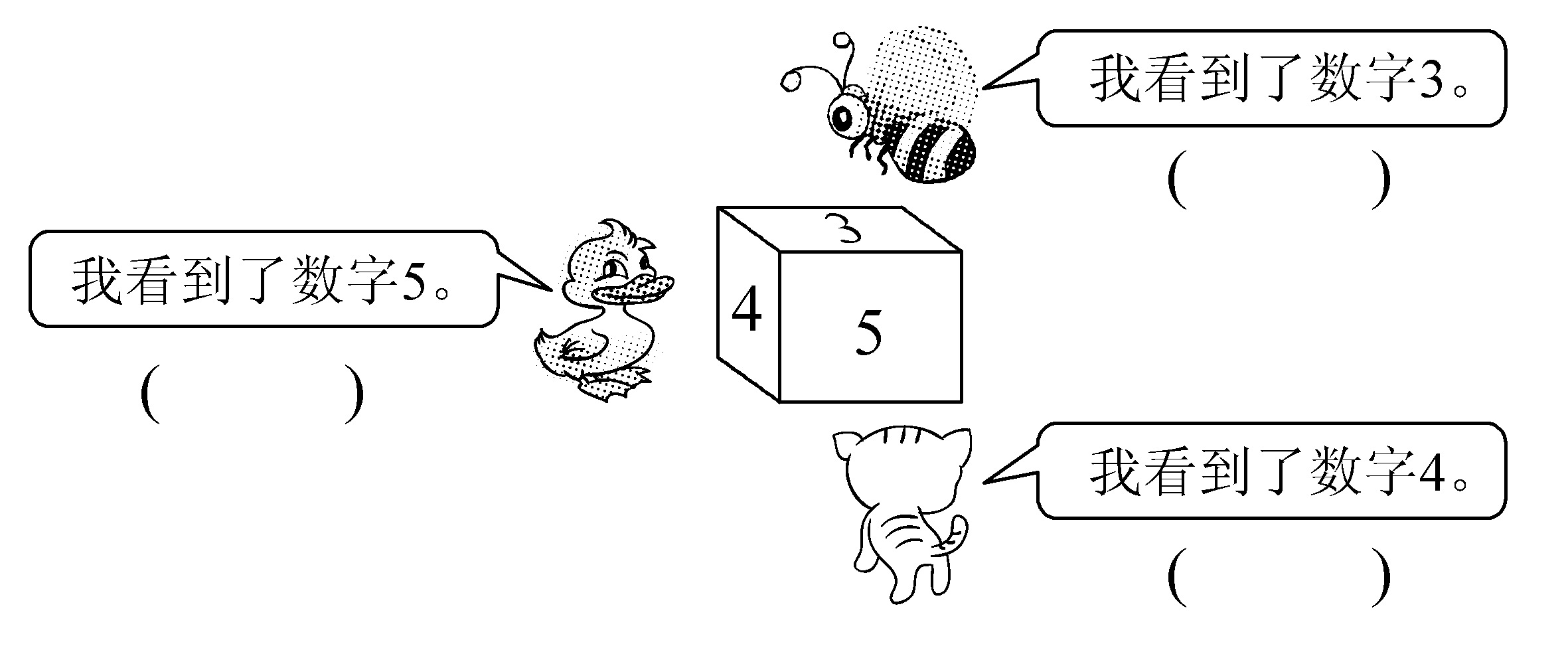 3. 下面右边的这四幅图分别是谁看到的?把名字写在( )里。