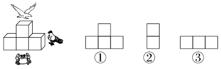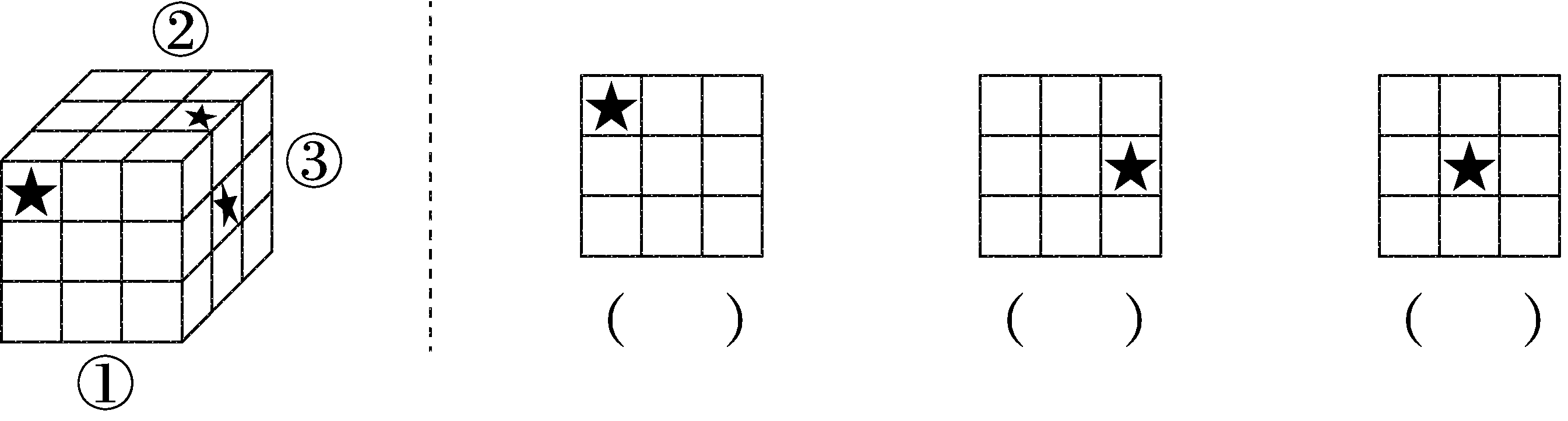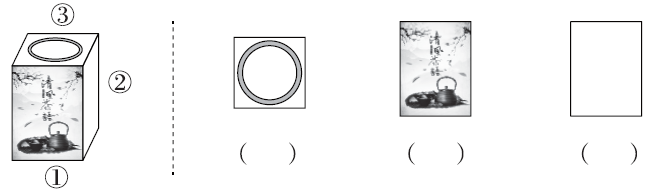 2. 右边的图分别是从茶叶盒的哪个位置看到的?把相应的序号填在括号里。