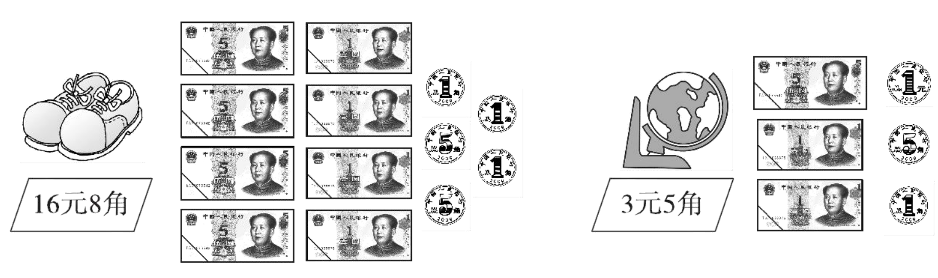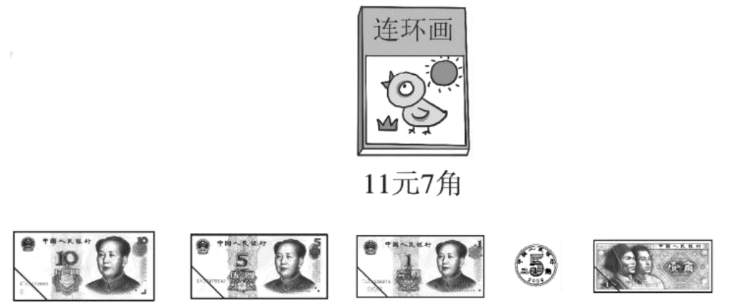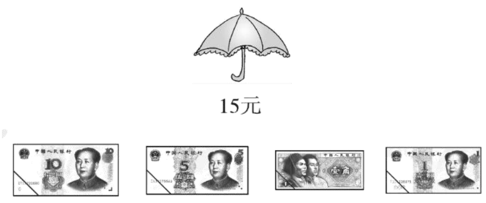 圈 3 张 5 元纸币,1 张 1 元纸币,3 枚 1 角硬币,1 枚 5 角硬币