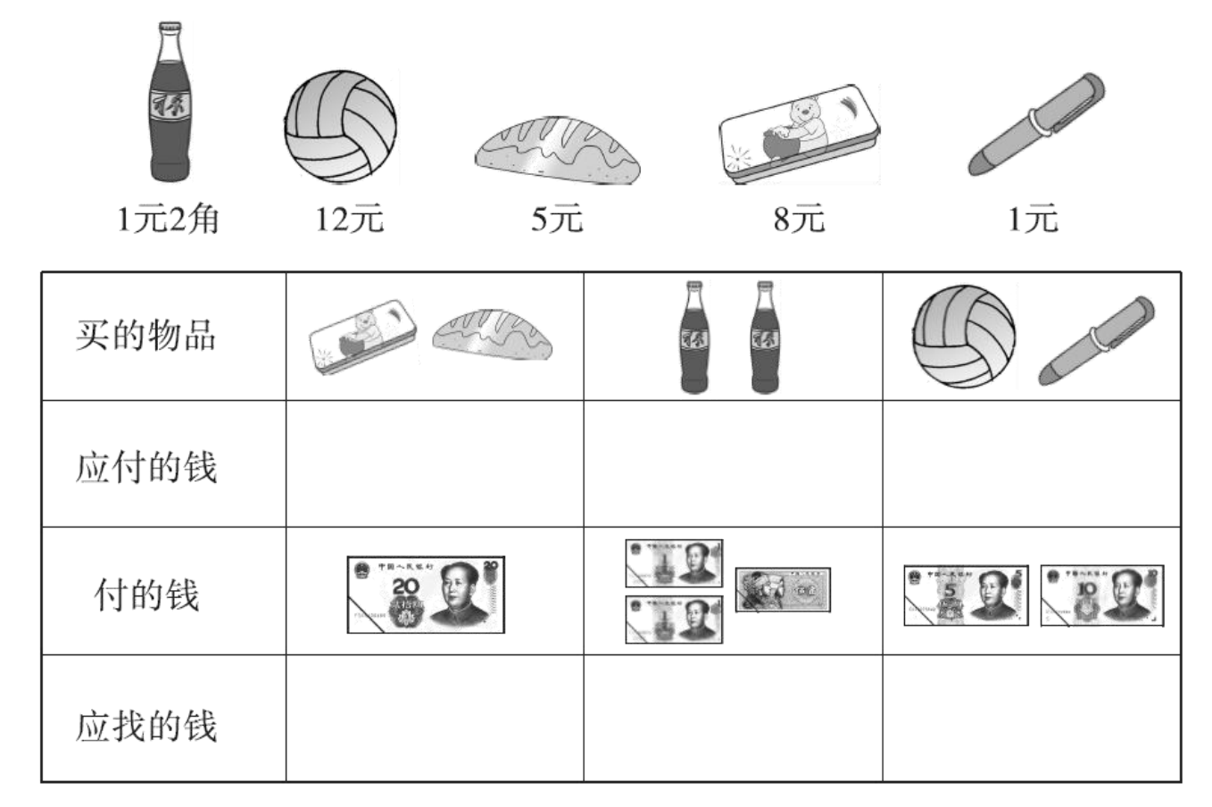 的钱:1 元 2 角+1 元 2 角=2 元 4 角,应找的钱:2 元 5 角-2 元 4 角=1 角;球