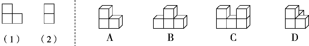 3.如下图,从正面看是图(1)的立体图形有( );从左面看是图(2)的立体图形有( );从左面和上面看都是由两个小正方形组成的立体图形是( )。