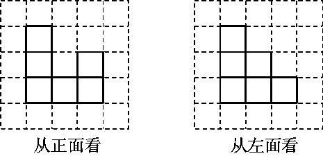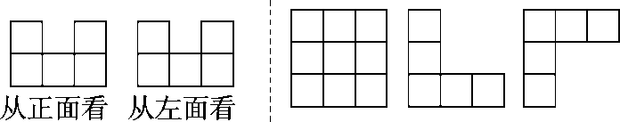 五、左图是一个由若干个小正方体搭建而成的几何体从正面和左面看到的图形,小刚用小正方体搭建以后,认为右图中的三个图形都可以是该几何体从上面看到的图形,你同意他的看法吗?(5分)