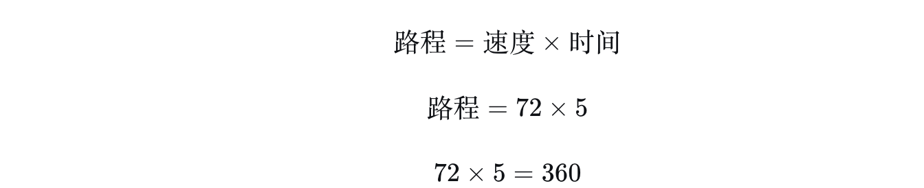 例1 一辆汽车以每小时72千米的速度行驶,从A城到B城需要5小时。A、B两城相距多少千米?