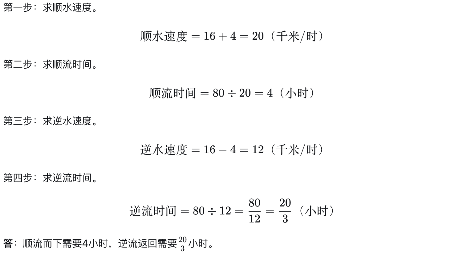 10. 一艘船在静水中的速度是每小时16千米,水流速度是每小时4千米。这艘船顺流而下80千米需要多少小时?逆流返回需要多少小时?
