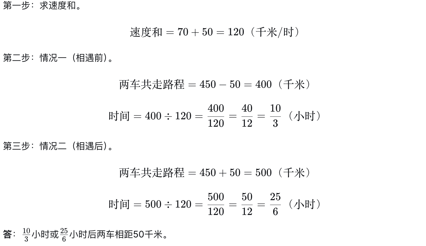 6. 甲、乙两车从相距450千米的两地同时相向而行,甲车每小时行70千米,乙车每小时行50千米。几小时后两车相距50千米?(提示:分两种情况:相遇前和相遇后)