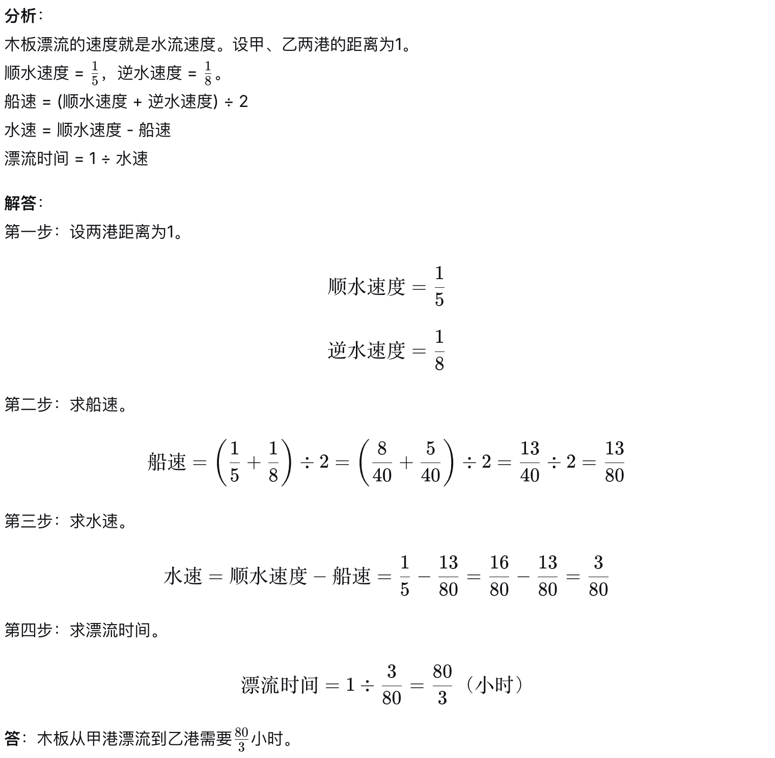 13. 一艘轮船从甲港到乙港顺流而行需要5小时,从乙港到甲港逆流而行需要8小时。如果一块木板从甲港漂流到乙港需要多少小时?