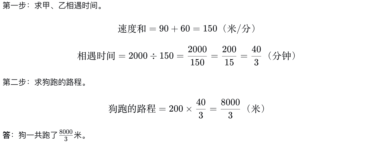 狗一直在跑,速度不变,所以狗跑的路程 = 狗的速度 × 狗跑的时间。