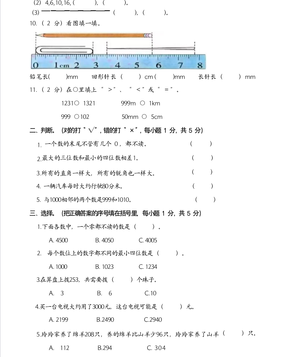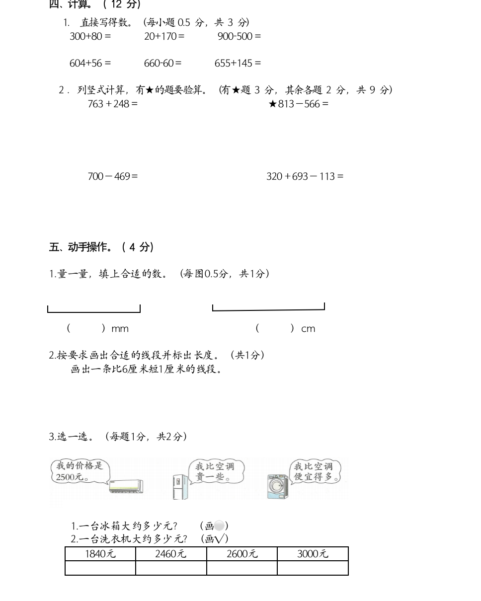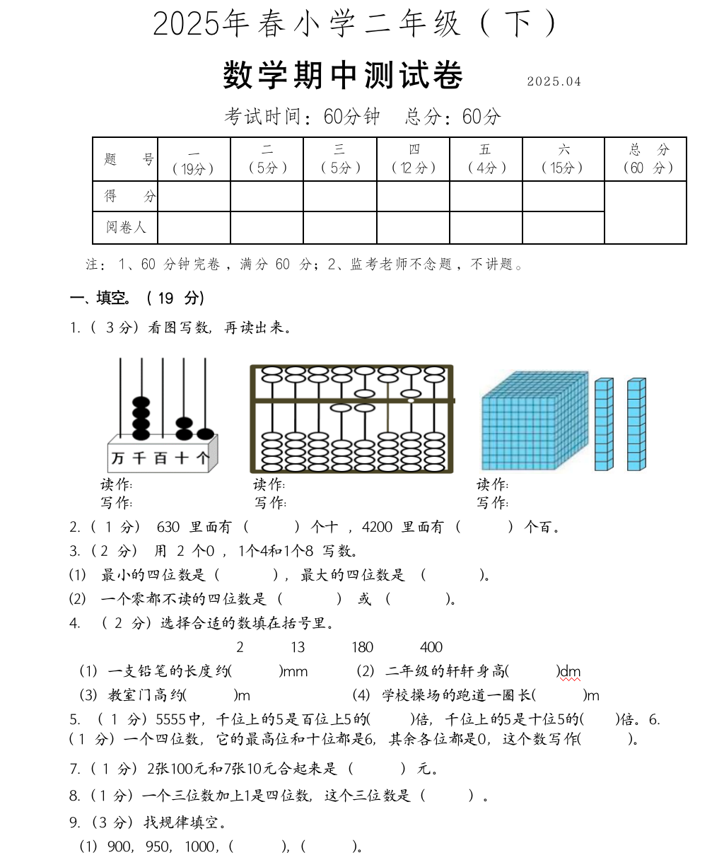 二年级下册数学期中试卷