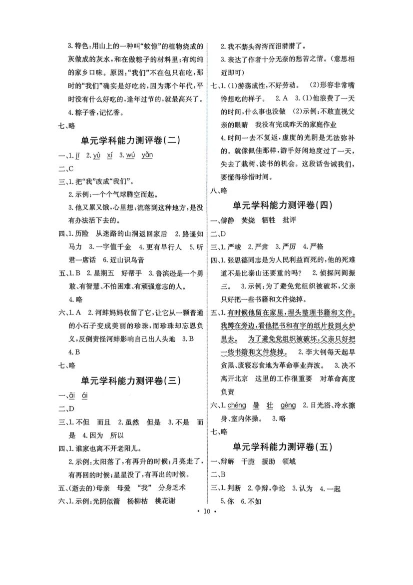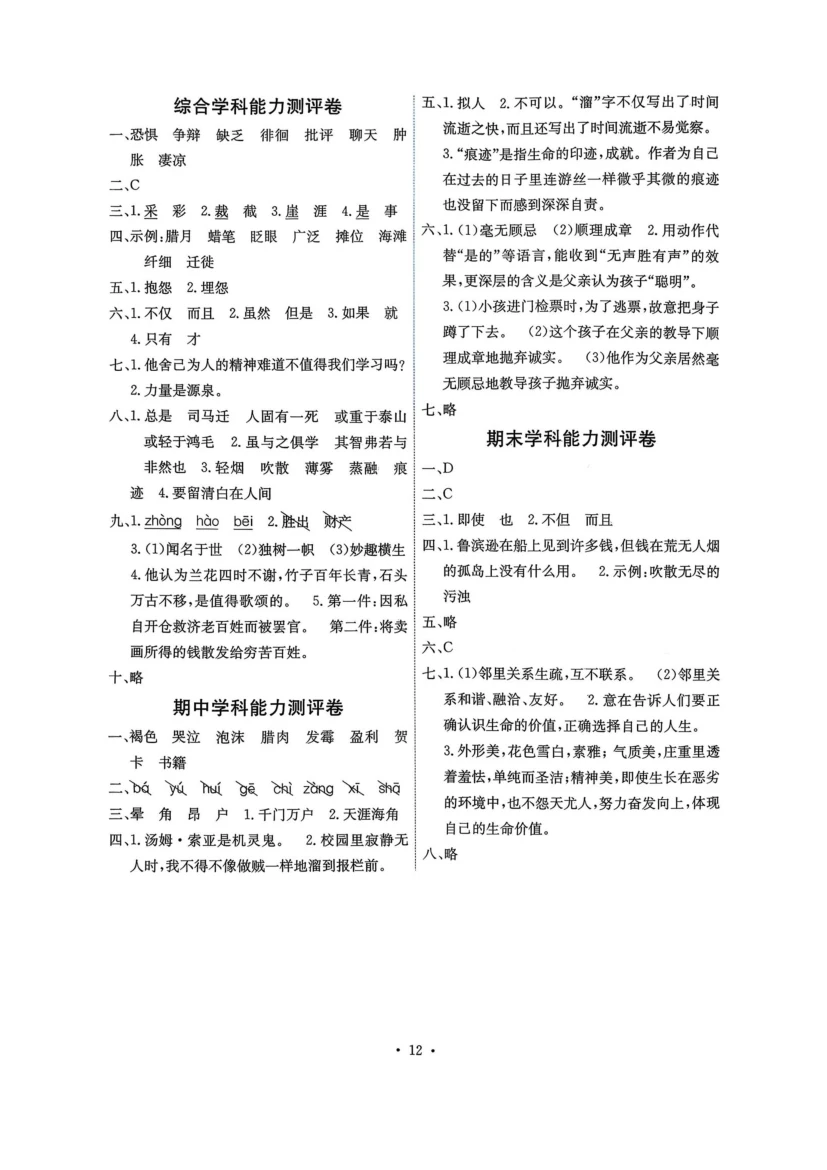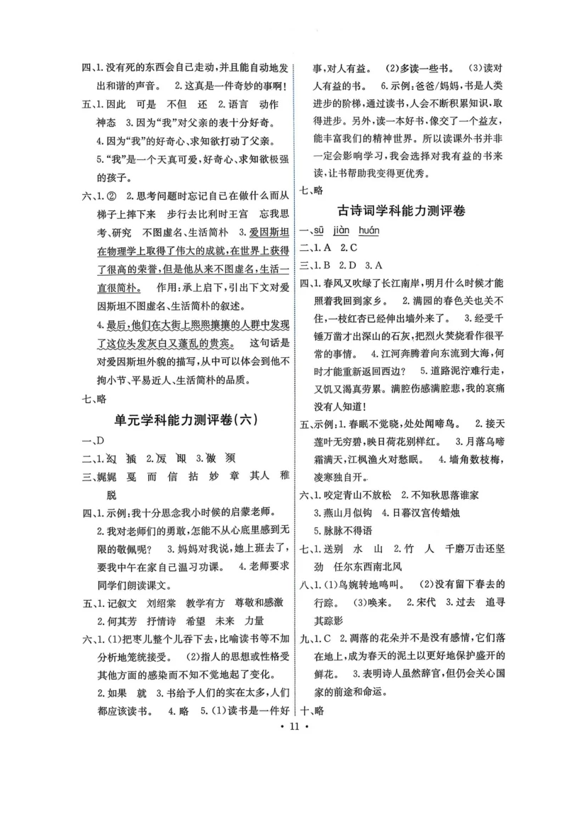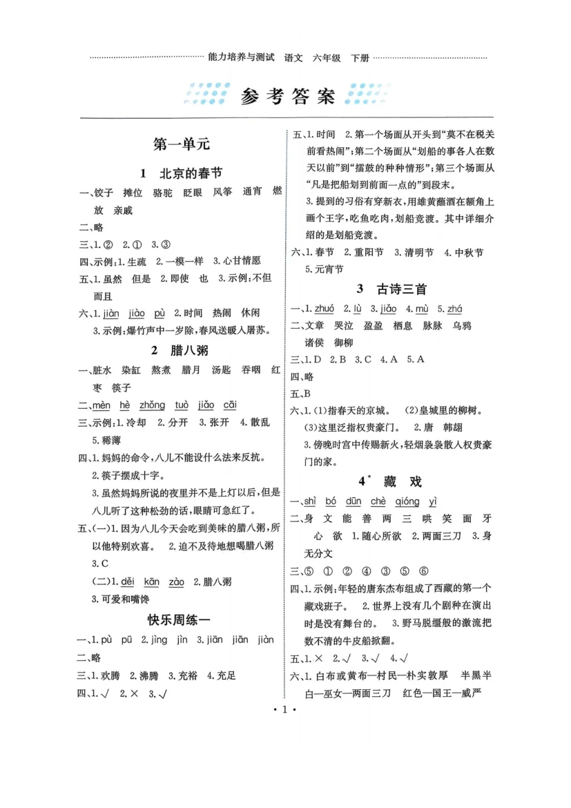 六年级下语文《能力培养与测试》答案