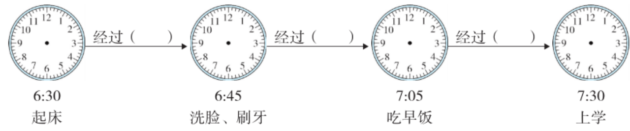 根据作息时间,在下面的钟面上画出时针和分针,并在括号里填上从上一个时刻到下一个时刻所经过的时间。