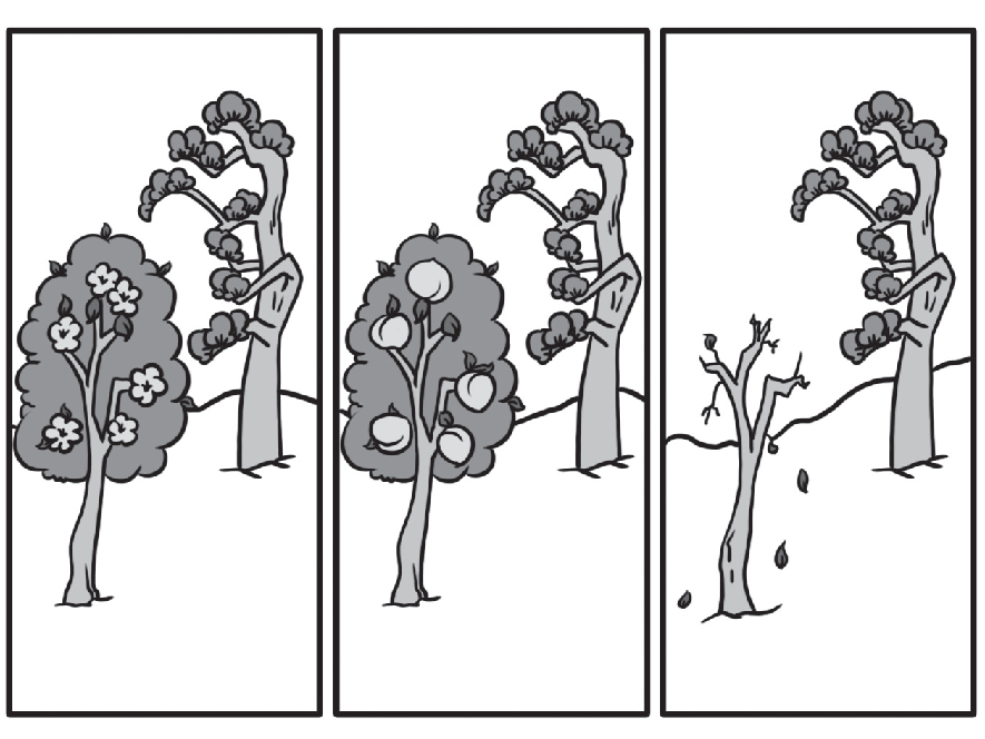 五、思路点拨:注意将三幅图拿来比较,看到相同和不同的地方,从而找到两棵树的不同特点。一棵随着季节的变化而变化,一棵四季常青。 例文略。