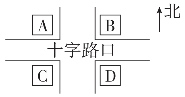 B在十字路口的( )面,C在十字路口的( )
