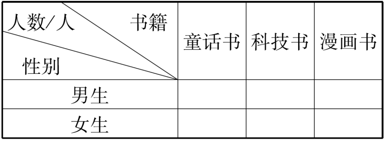 男生中有2人喜欢童话书,喜欢科技书的比喜欢童话书的多9人,喜欢漫画书的有5人。女生中喜欢童话书的比男生喜欢科技书的多2人,喜欢科技书的有3人,喜欢漫画书的有8人。